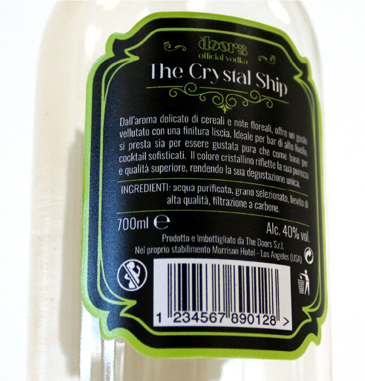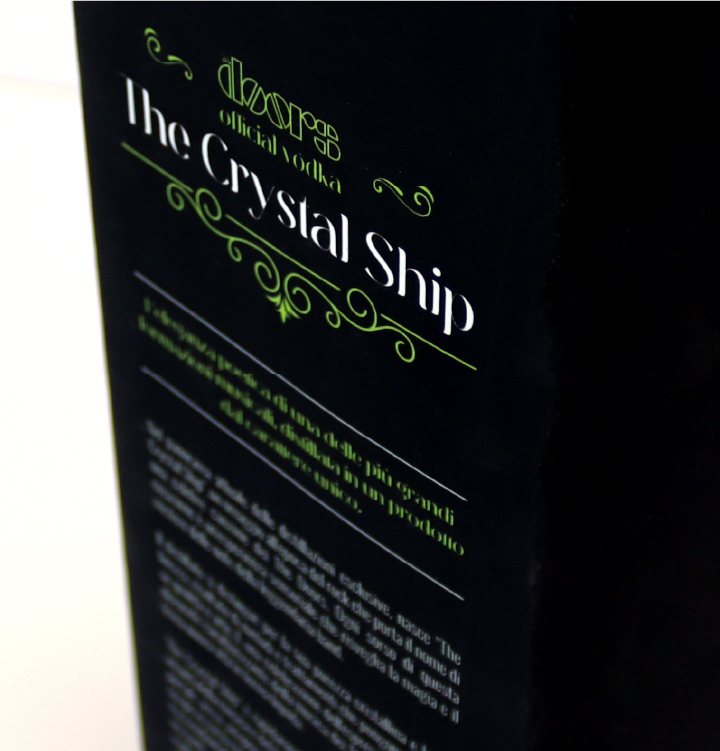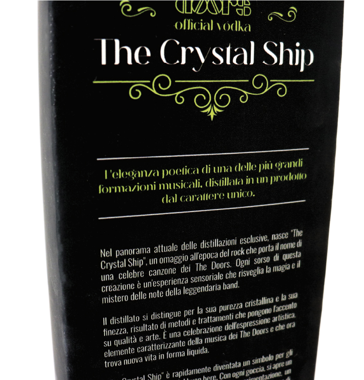 Il nome deriva da una delle canzoni più famose dell’opera, “The Crystal Ship”, che con la sua elegante atmosfera sonora, ben si presta all’essenza di una bevanda come la vodka, alcolico “cristallino”, così come sottolineato dal titolo del brano. Per il packaging si è adottato uno stile quasi Art Nouveau, che si sposa bene con l’eleganza e la suggestività della musica dei Doors.