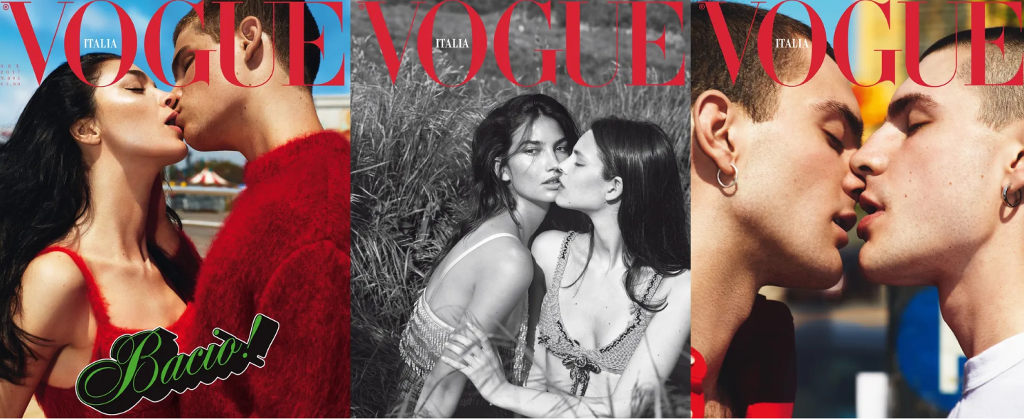 Il numero di settembre 2017 di Vogue Italia, per la prima volta interamente dedicato al nostro Paese, ha come protagonista la top model Maricarla Boscono e una cover speciale dedicata ai baci etero e gay. La prima delle copertine, dedicata al tema del bacio, vuole essere una presa di posizione contro ogni forma di discriminazione di genere; raffigura infatti tre diverse coppie nell’atto di scambiarsi effusioni: eterosessuale (dove compaiono Mariacarla Boscono con il modello italiano Federico Spinas) e omosessuale: quelli delle modelle Lily Aldridge e Vittoria Ceretti, e dei modelli Pablo Rousson e Edoardo Velickskov.